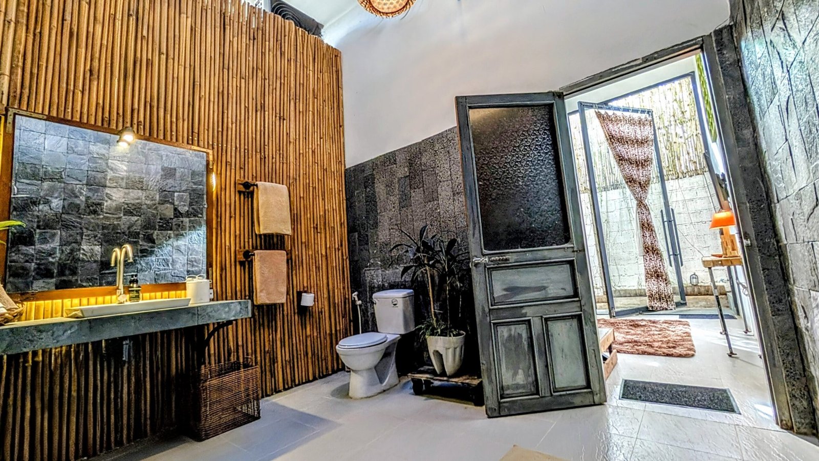 - Unique Indoor-Outdoor Experience: Enjoy an indoor-outdoor bathroom that seamlessly blends comfort with nature, complemented by high ceilings and glass doors that maximize natural light and fresh breezes.